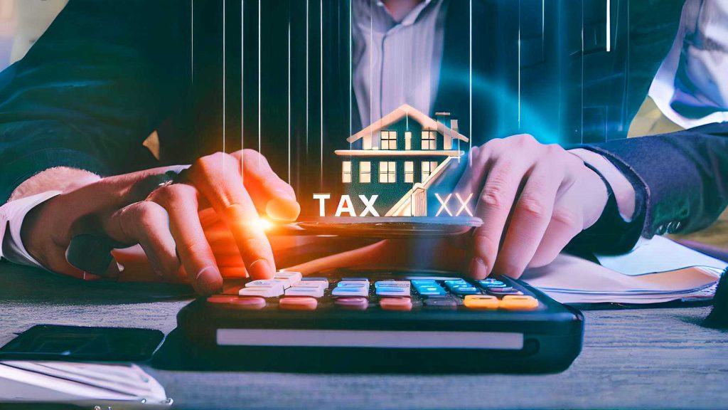 Hände tippen auf einem Taschenrechner. Darüber ein Haus Symbol.